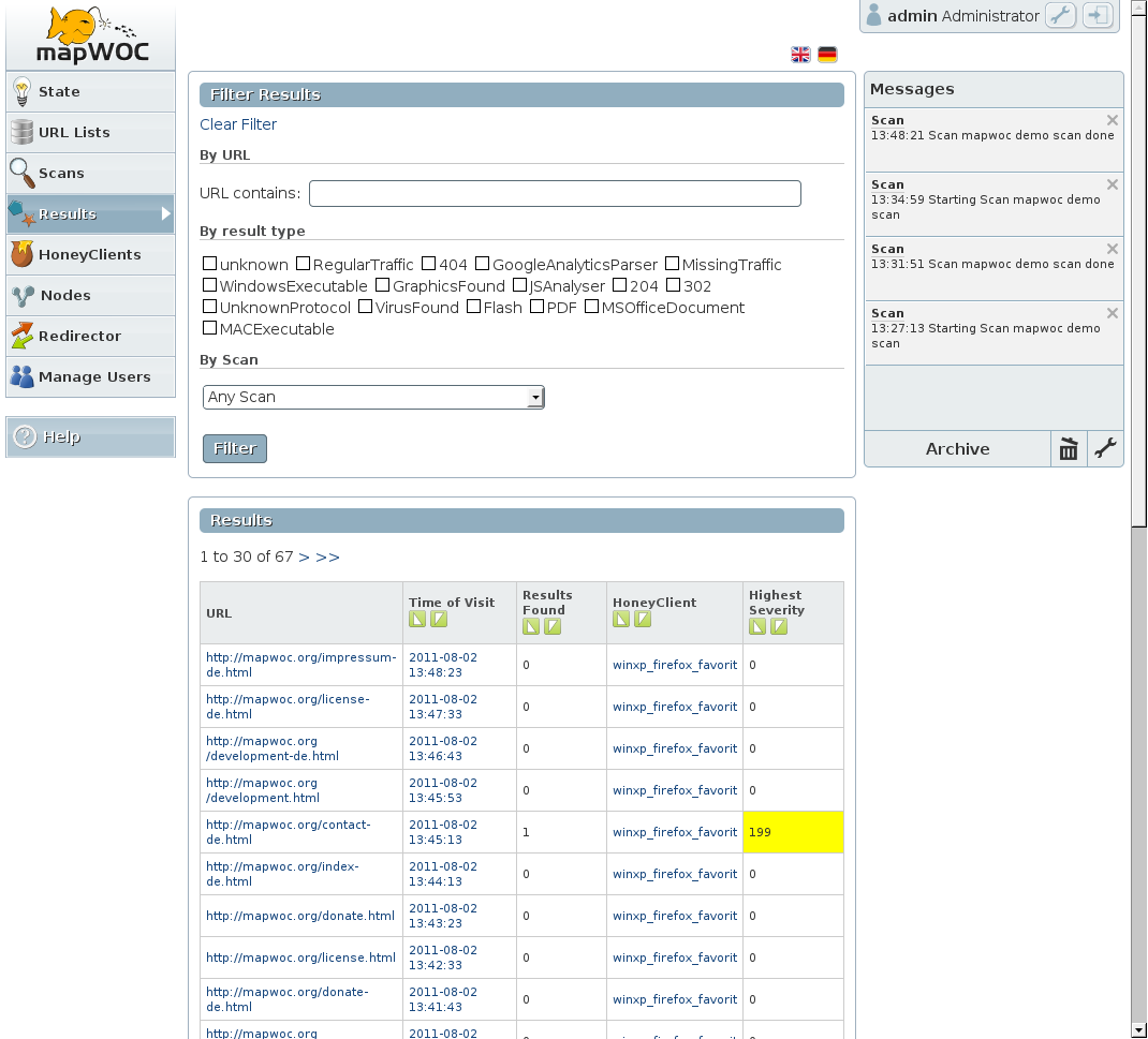 mapWOC provides a high-interactive client-side honeypot or honeyclient. It is a massive automated passive Web Observation Center (mapWOC) to check website integrity and security: